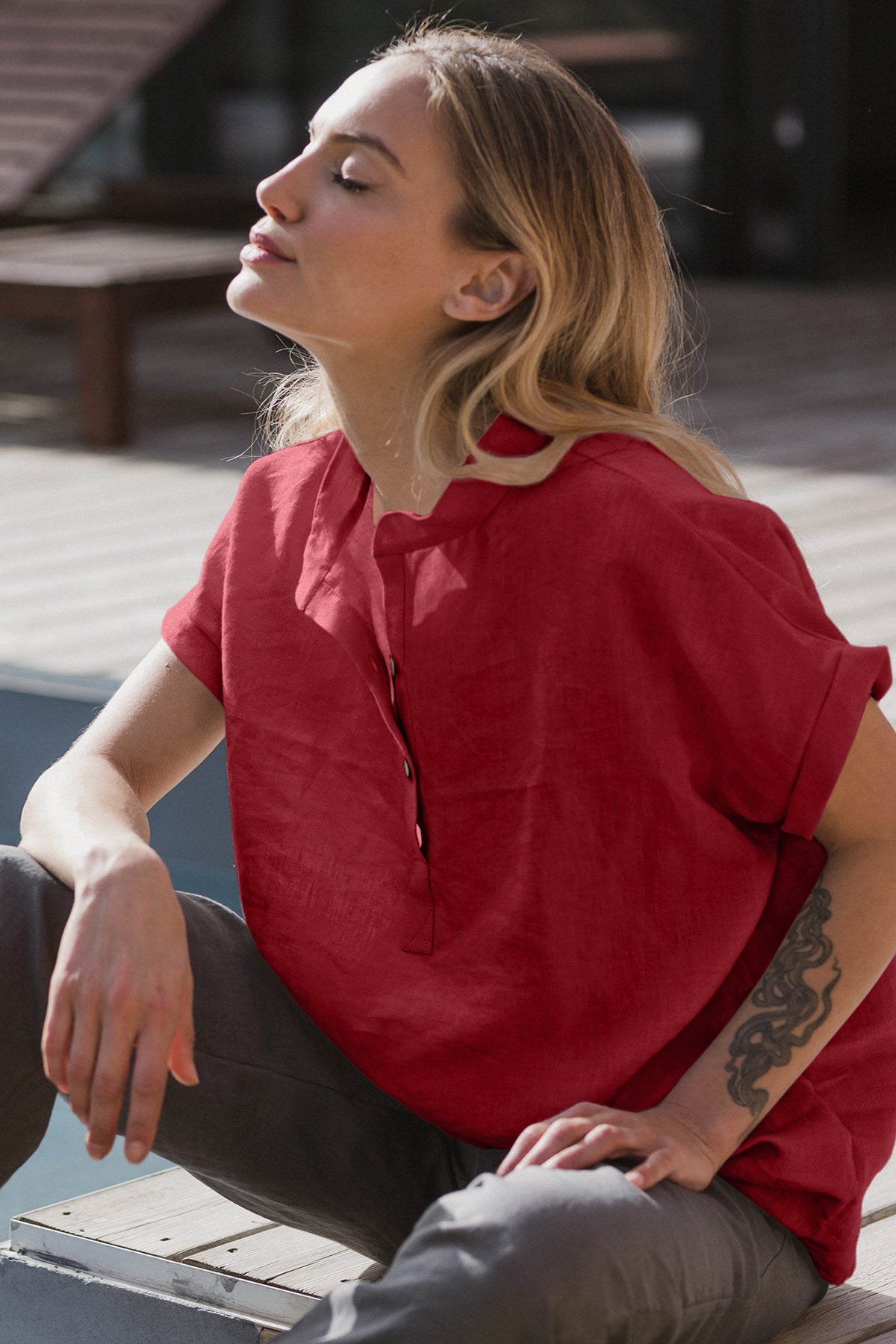 Chemisier femme manches courtes en lin bordeaux - Flor